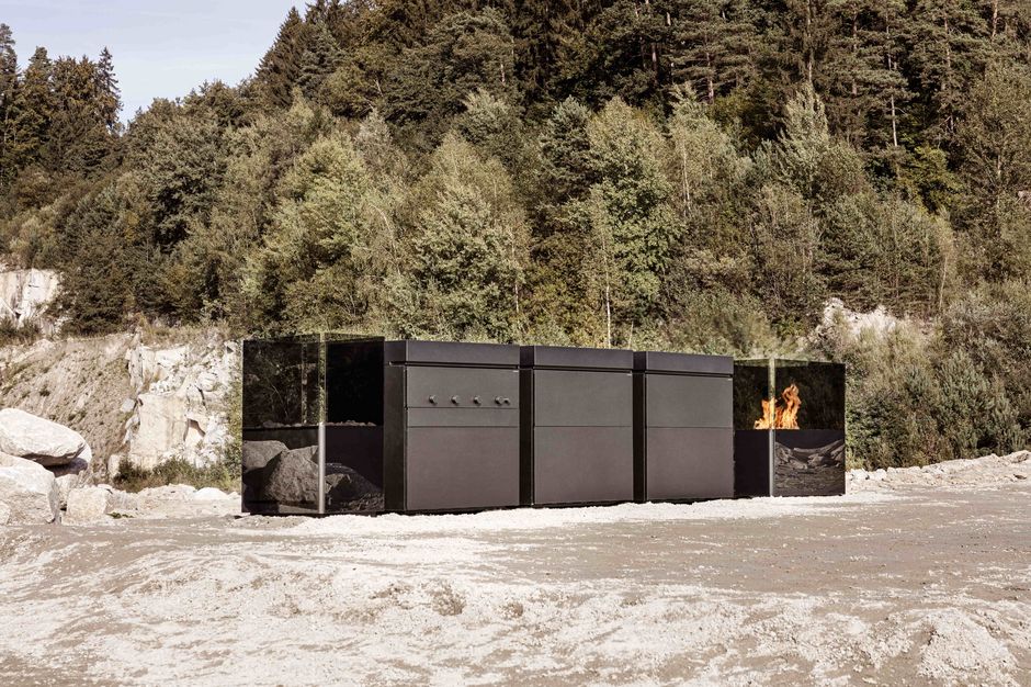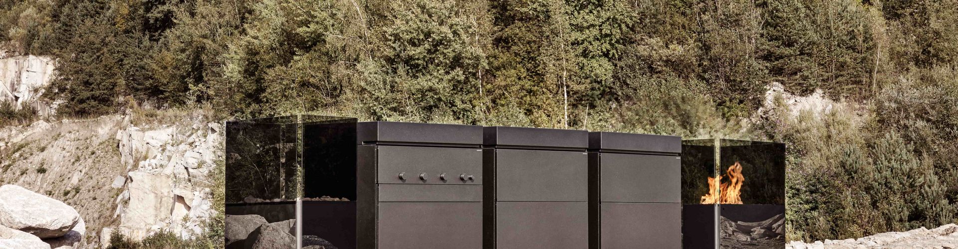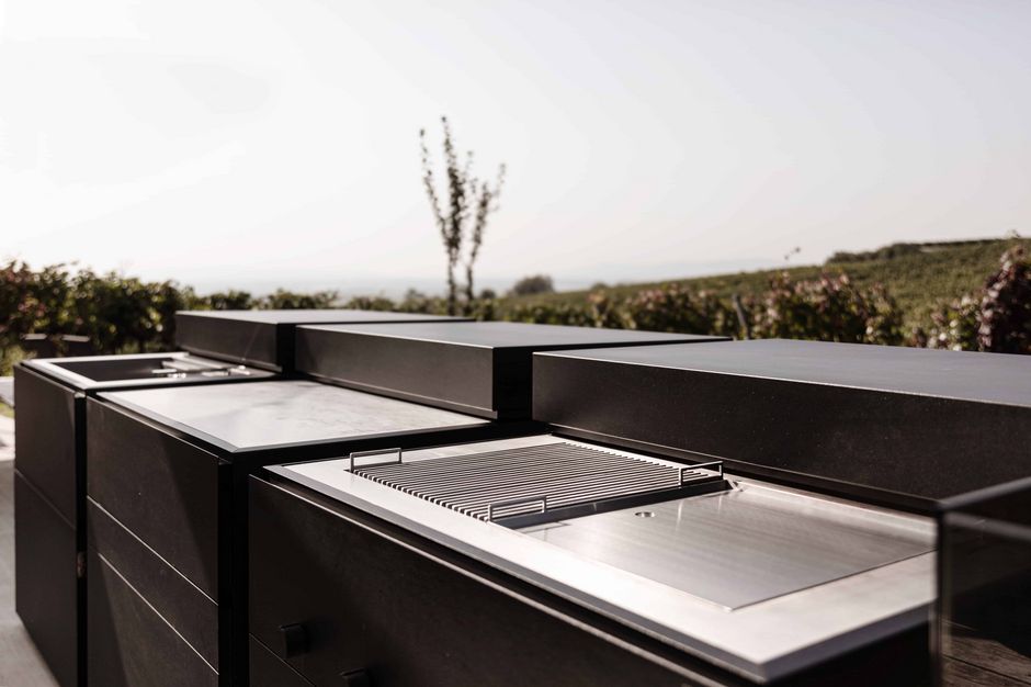 The modular outdoor kitchen ROCK.AIR combines innovative design with high-tech functionality. Individual kitchen cubes can be combined separately to serve different purposes: Gas or lava grill, sink, dishwasher, refrigerator and freezer element with ice maker, storage space or fireplace.