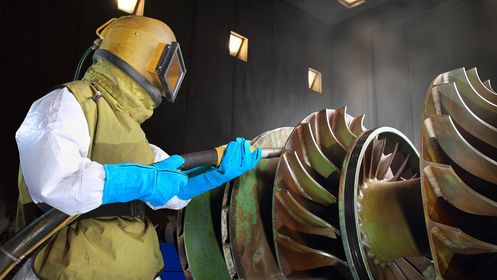 During so-called "sweeping", the workpiece is roughened under low pressure (2 to 3 bar) with a sharp-edged abrasive. This improves the adhesion of the powder to the surface. Any residue from chemical paint stripping is also removed in this step. To prevent contact corrosion, it is important to use a separate blasting booth for each substrate and to avoid the use of blasting granulates.