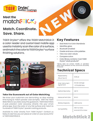 Match. Coordinate. Save. Share. That’s the MatchStick 2 in a nutshell. Our MatchStick 2 is a combination of a color reader and customized mobile opposed to instantly scan the color of a surface, and match the color to TIGER Drylac® surface finishing solutions. We know your customers are demanding, so stop wasting time trying to match powder coat samples. With the TIGER MatchStick 2 you take away the guesswork. TIGER MatchStick 2 puts precision color accuracy directly into your smart phone app. Scan the color of any flat surface and match to hundreds of TIGER Drylac® powder coating products. Available to order directly from the TIGER Drylac® webshop. Click the link below to place an order for a TIGER MatchStick 2 today!